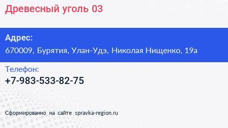 Древесный уголь 03 по адресу 670009, Бурятия, Улан-Удэ, Николая Нищенко, 19а в дальнейшем Организация, размещена в следующих категориях: