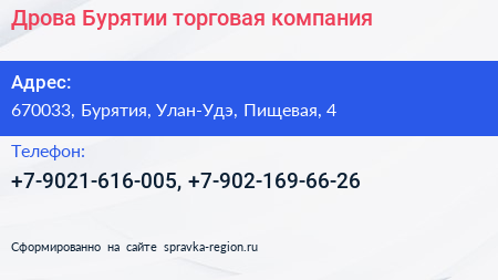 Дрова Бурятии, торговая компания по адресу 670033, Бурятия, Улан-Удэ, Пищевая, 4 в дальнейшем Организация, размещена в следующих категориях: