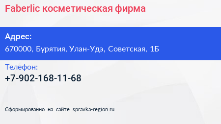 Faberlic, косметическая фирма по адресу 670000, Бурятия, Улан-Удэ, Советская, 1Б в дальнейшем Организация, размещена в следующих категориях: