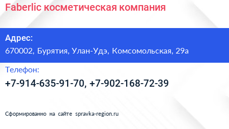 Faberlic, косметическая компания по адресу 670002, Бурятия, Улан-Удэ, Комсомольская, 29а в дальнейшем Организация, размещена в следующих категориях: