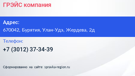 ГРЭЙС, компания по адресу 670042, Бурятия, Улан-Удэ, Жердева, 2д в дальнейшем Организация, размещена в следующих категориях:
