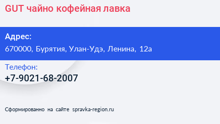 GUT, чайно-кофейная лавка по адресу 670000, Бурятия, Улан-Удэ, Ленина, 12а в дальнейшем Организация, размещена в следующих категориях: