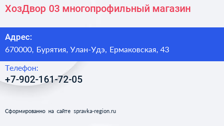 ХозДвор 03, многопрофильный магазин по адресу 670000, Бурятия, Улан-Удэ, Ермаковская, 43 в дальнейшем Организация, размещена в следующих категориях: