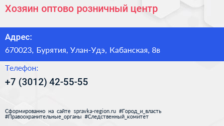 Хозяин, оптово-розничный центр по адресу 670023, Бурятия, Улан-Удэ, Кабанская, 8в в дальнейшем Организация, размещена в следующих категориях: