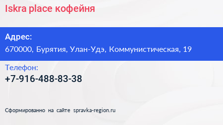 Iskra place, кофейня по адресу 670000, Бурятия, Улан-Удэ, Коммунистическая, 19 в дальнейшем Организация, размещена в следующих категориях: