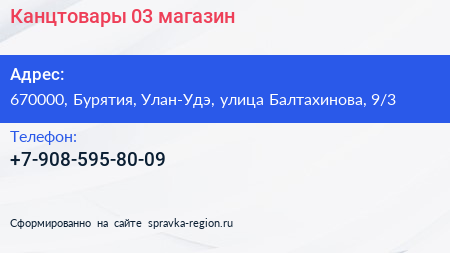 Канцтовары 03, магазин по адресу 670000, Бурятия, Улан-Удэ, улица Балтахинова, 9/3 в дальнейшем Организация, размещена в следующих категориях: