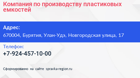 Компания по производству пластиковых емкостей по адресу 670004, Бурятия, Улан-Удэ, Новгородская улица, 17 в дальнейшем Организация, размещена в следующих категориях: