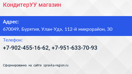 КондитерУУ, магазин по адресу 670049, Бурятия, Улан-Удэ, 112-й микрорайон, 30 в дальнейшем Организация, размещена в следующих категориях: