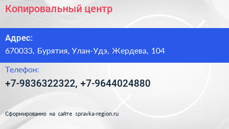 Копировальный центр по адресу 670033, Бурятия, Улан-Удэ, Жердева, 104 в дальнейшем Организация, размещена в следующих категориях:
