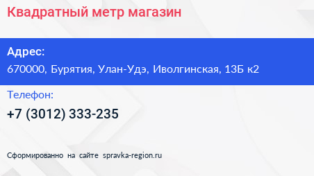 Квадратный метр, магазин по адресу 670000, Бурятия, Улан-Удэ, Иволгинская, 13Б к2 в дальнейшем Организация, размещена в следующих категориях:
