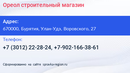 Ореол, строительный магазин по адресу 670000, Бурятия, Улан-Удэ, Воровского, 27 в дальнейшем Организация, размещена в следующих категориях: