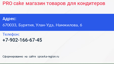 PRO cake, магазин товаров для кондитеров по адресу 670033, Бурятия, Улан-Удэ, Намжилова, 6 в дальнейшем Организация, размещена в следующих категориях: