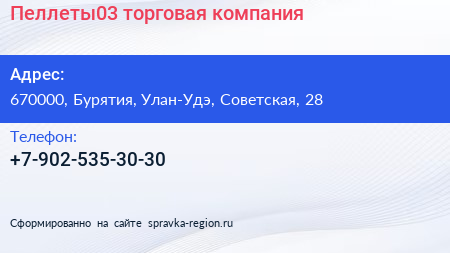 Пеллеты03, торговая компания по адресу 670000, Бурятия, Улан-Удэ, Советская, 28 в дальнейшем Организация, размещена в следующих категориях: