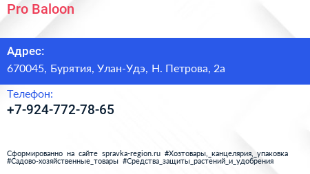 Pro Baloon по адресу 670045, Бурятия, Улан-Удэ, Н. Петрова, 2а в дальнейшем Организация, размещена в следующих категориях:
