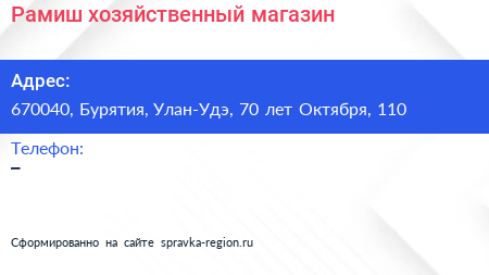 Рамиш, хозяйственный магазин по адресу 670040, Бурятия, Улан-Удэ, 70 лет Октября, 110 в дальнейшем Организация, размещена в следующих категориях:
