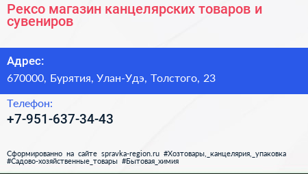 Рексо, магазин канцелярских товаров и сувениров по адресу 670000, Бурятия, Улан-Удэ, Толстого, 23 в дальнейшем Организация, размещена в следующих категориях: