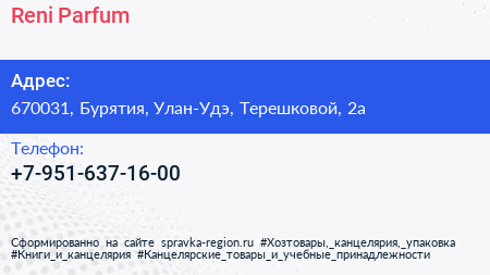 Reni Parfum по адресу 670031, Бурятия, Улан-Удэ, Терешковой, 2а в дальнейшем Организация, размещена в следующих категориях: