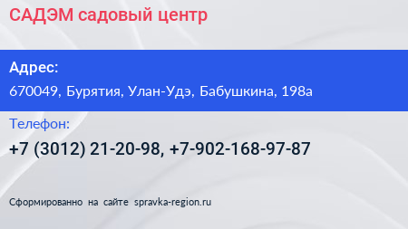 САДЭМ, садовый центр по адресу 670049, Бурятия, Улан-Удэ, Бабушкина, 198а в дальнейшем Организация, размещена в следующих категориях: