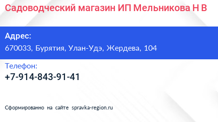Садоводческий магазин, ИП Мельникова Н.В. по адресу 670033, Бурятия, Улан-Удэ, Жердева, 104 в дальнейшем Организация, размещена в следующих категориях: