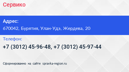 Сервико по адресу 670042, Бурятия, Улан-Удэ, Жердева, 20 в дальнейшем Организация, размещена в следующих категориях: