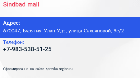 Sindbad mall по адресу 670047, Бурятия, Улан-Удэ, улица Сахьяновой, 9е/2 в дальнейшем Организация, размещена в следующих категориях: