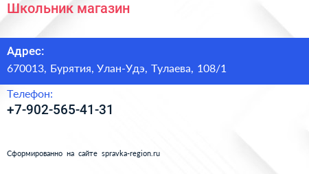 Школьник, магазин по адресу 670013, Бурятия, Улан-Удэ, Тулаева, 108/1 в дальнейшем Организация, размещена в следующих категориях: