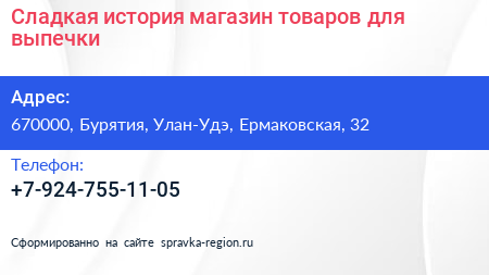 Сладкая история, магазин товаров для выпечки по адресу 670000, Бурятия, Улан-Удэ, Ермаковская, 32 в дальнейшем Организация, размещена в следующих категориях: