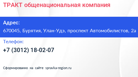 ТРАКТ, общенациональная компания по адресу 670045, Бурятия, Улан-Удэ, проспект Автомобилистов, 2а в дальнейшем Организация, размещена в следующих категориях: