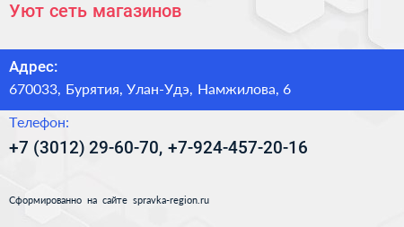 Уют, сеть магазинов по адресу 670033, Бурятия, Улан-Удэ, Намжилова, 6 в дальнейшем Организация, размещена в следующих категориях: