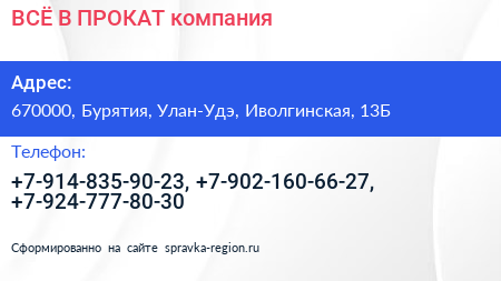 ВСЁ В ПРОКАТ, компания по адресу 670000, Бурятия, Улан-Удэ, Иволгинская, 13Б в дальнейшем Организация, размещена в следующих категориях: