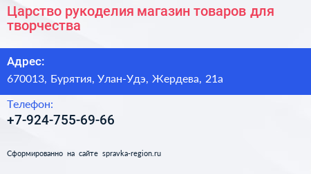 Царство рукоделия, магазин товаров для творчества по адресу 670013, Бурятия, Улан-Удэ, Жердева, 21а в дальнейшем Организация, размещена в следующих категориях:
