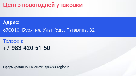 Центр новогодней упаковки по адресу 670010, Бурятия, Улан-Удэ, Гагарина, 32 в дальнейшем Организация, размещена в следующих категориях: