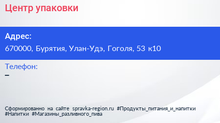Центр упаковки по адресу 670000, Бурятия, Улан-Удэ, Гоголя, 53 к10 в дальнейшем Организация, размещена в следующих категориях: