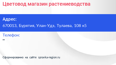 Цветовод, магазин растениеводства по адресу 670013, Бурятия, Улан-Удэ, Тулаева, 108 к5 в дальнейшем Организация, размещена в следующих категориях:
