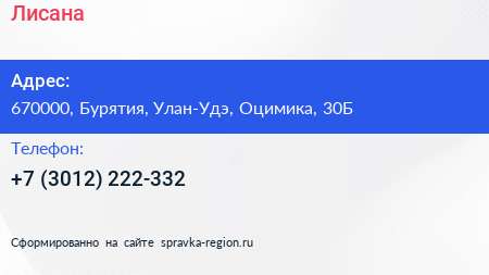 Лисана по адресу 670000, Бурятия, Улан-Удэ, Оцимика, 30Б в дальнейшем Организация, размещена в следующих категориях: