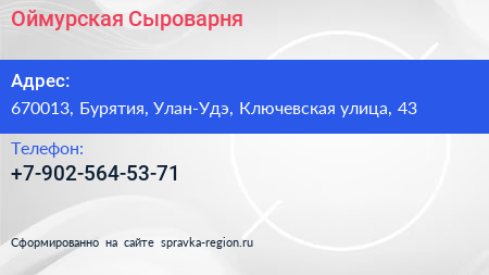 Оймурская Сыроварня по адресу 670013, Бурятия, Улан-Удэ, Ключевская улица, 43 в дальнейшем Организация, размещена в следующих категориях: