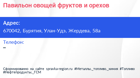 Павильон овощей, фруктов и орехов по адресу 670042, Бурятия, Улан-Удэ, Жердева, 58а в дальнейшем Организация, размещена в следующих категориях: