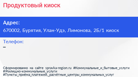 Продуктовый киоск по адресу 670002, Бурятия, Улан-Удэ, Лимонова, 2Б/1 киоск в дальнейшем Организация, размещена в следующих категориях: