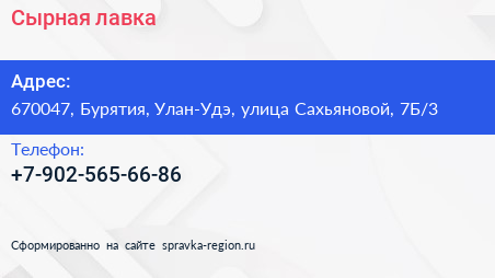 Сырная лавка по адресу 670047, Бурятия, Улан-Удэ, улица Сахьяновой, 7Б/3 в дальнейшем Организация, размещена в следующих категориях: