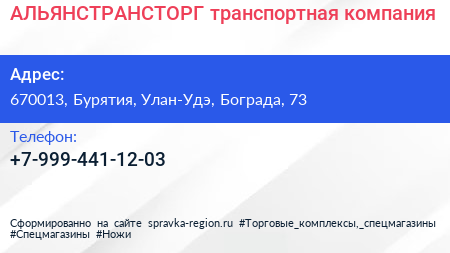 АЛЬЯНСТРАНСТОРГ, транспортная компания по адресу 670013, Бурятия, Улан-Удэ, Бограда, 73 в дальнейшем Организация, размещена в следующих категориях: