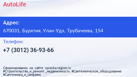 AutoLife по адресу 670031, Бурятия, Улан-Удэ, Трубачеева, 154 в дальнейшем Организация, размещена в следующих категориях: