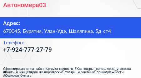 Автономера03 по адресу 670045, Бурятия, Улан-Удэ, Шаляпина, 5д ст4 в дальнейшем Организация, размещена в следующих категориях: