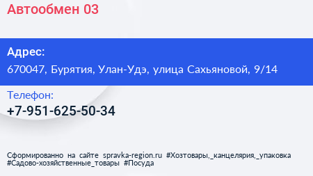 Автообмен 03 по адресу 670047, Бурятия, Улан-Удэ, улица Сахьяновой, 9/14 в дальнейшем Организация, размещена в следующих категориях: