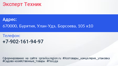 Эксперт-Техник по адресу 670000, Бурятия, Улан-Удэ, Борсоева, 105 к10 в дальнейшем Организация, размещена в следующих категориях: