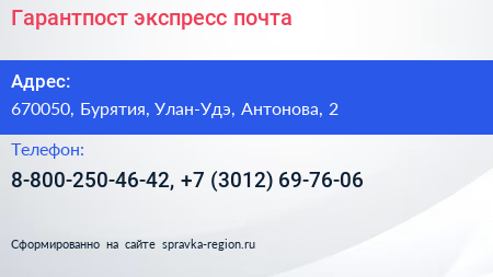 Гарантпост, экспресс-почта по адресу 670050, Бурятия, Улан-Удэ, Антонова, 2 в дальнейшем Организация, размещена в следующих категориях: