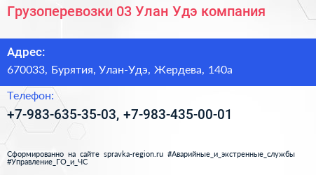 Грузоперевозки 03 Улан-Удэ, компания по адресу 670033, Бурятия, Улан-Удэ, Жердева, 140а в дальнейшем Организация, размещена в следующих категориях:
