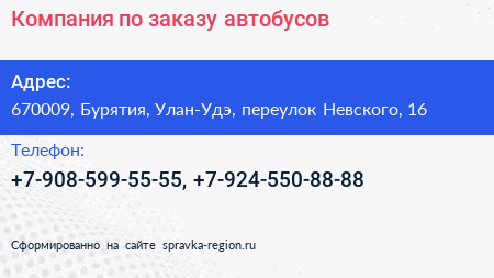 Компания по заказу автобусов по адресу 670009, Бурятия, Улан-Удэ, переулок Невского, 16 в дальнейшем Организация, размещена в следующих категориях: