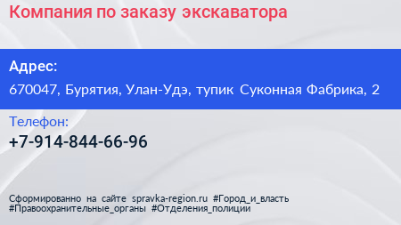 Компания по заказу экскаватора по адресу 670047, Бурятия, Улан-Удэ, тупик Суконная Фабрика, 2 в дальнейшем Организация, размещена в следующих категориях: