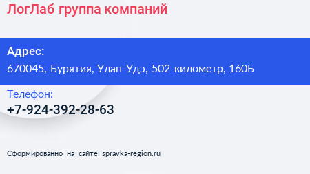 ЛогЛаб, группа компаний по адресу 670045, Бурятия, Улан-Удэ, 502 километр, 160Б в дальнейшем Организация, размещена в следующих категориях: