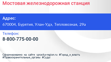Мостовая, железнодорожная станция по адресу 670004, Бурятия, Улан-Удэ, Тепловозная, 29а в дальнейшем Организация, размещена в следующих категориях: